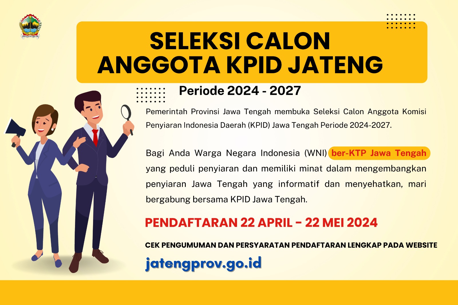 SEMARANG – Pendaftaran calon anggota komisi Penyiaran Indonesia Daerah (KPID) Jawa Tengah periode 2024-2027, bergulir sejak 22 April – 22 Mei 2024. Dari proses itu, diharapkan menjaring calon komi...